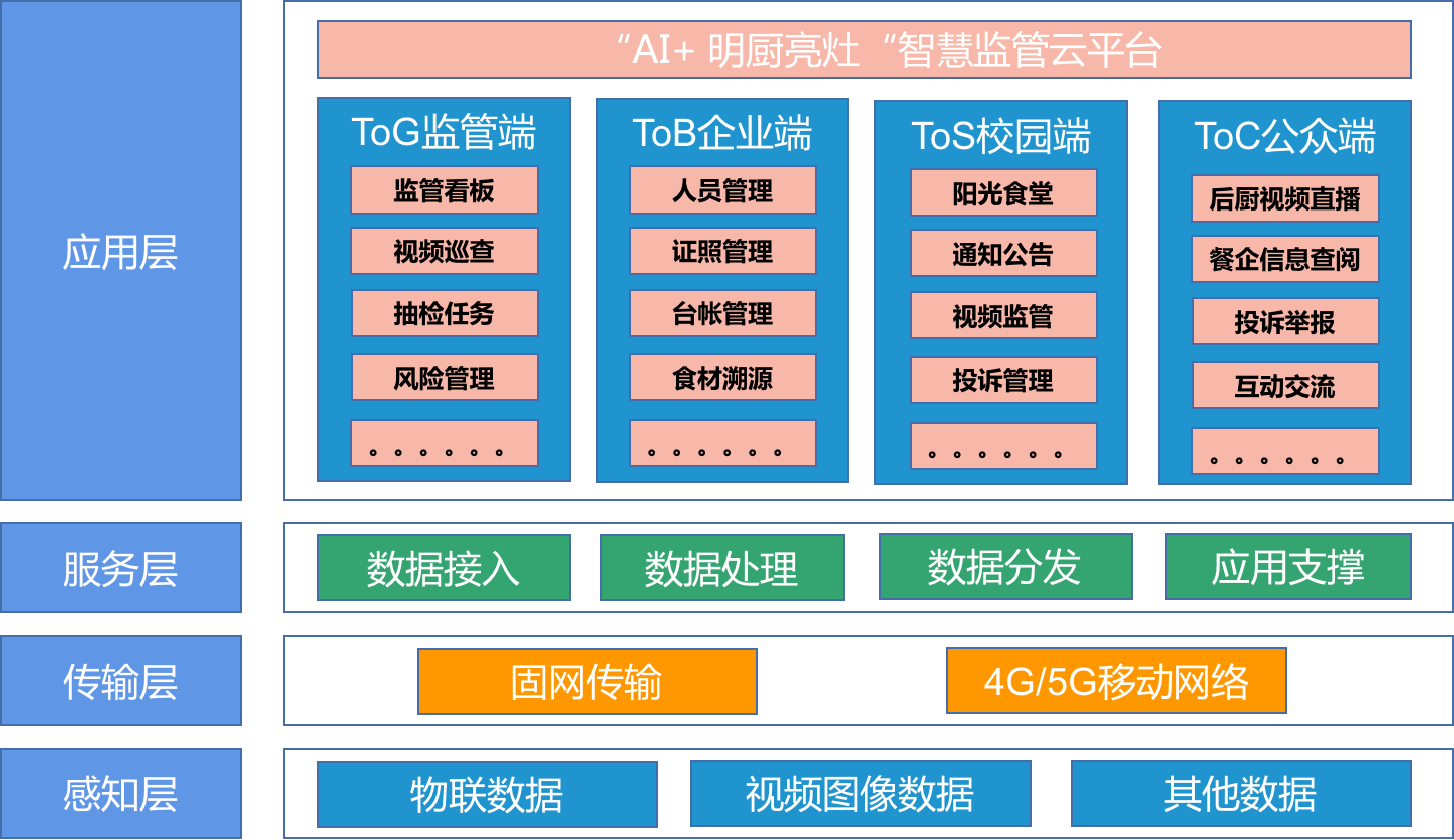 通過構(gòu)建“人工智能物聯(lián)網(wǎng)+ 全民食安” 智慧監(jiān)管云平臺,幫助實現(xiàn)食材食材供應(yīng)保鮮數(shù)據(jù)可感,食品加工過程便捷可視,廚房違規(guī)操作智能可知 ,執(zhí)法過程數(shù)據(jù)可依,公眾監(jiān)督隨時可訴,全程食材食品數(shù)據(jù)可溯,從而有效促進食品安全行業(yè)的政府科學監(jiān)管、企業(yè)主體自律、校園規(guī)范管理和公眾監(jiān)督共治。